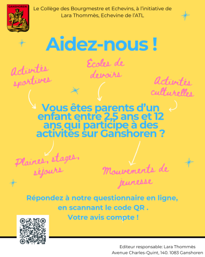 Vous êtes parents d’un enfant entre 2,5ans et 12 ans qui participe à des activités ATL sur Ganshoren? Aidez-nous en répondant à notre questionnaire : https://forms.gle/6AphvwMgo3zhCNbr6